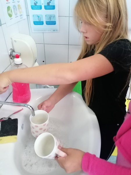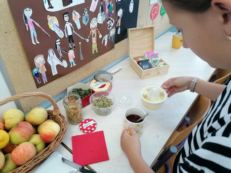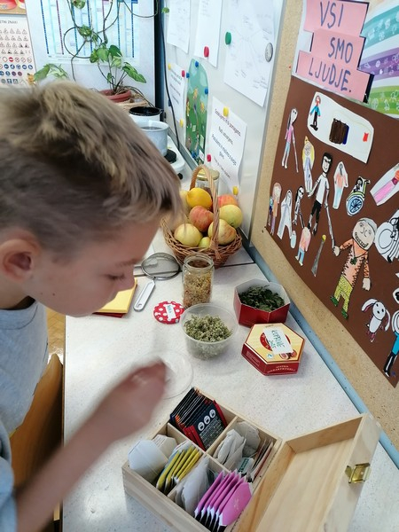 Po predavanju smo se odpravili na krajši sprehod po bližnji okolici šole. Ker je prejšnji dan deževalo in je bilo zunaj še dokaj hladno, smo si po vrnitvi v razred skuhali čaj z medom in limono, ki nas je prijetno ogrel. Po pitju je vsak učenec sam pomil svoj lonček, kar je bilo prav prijetno opazovati.