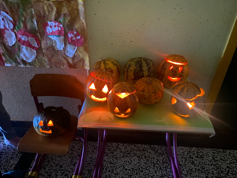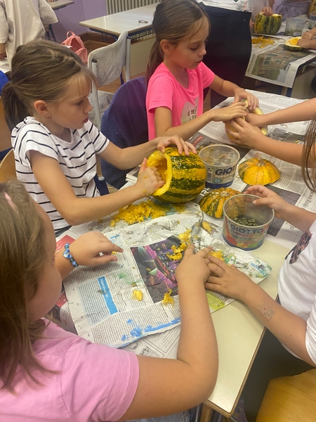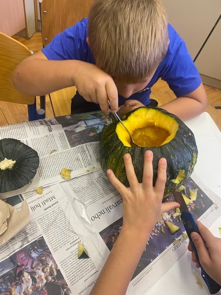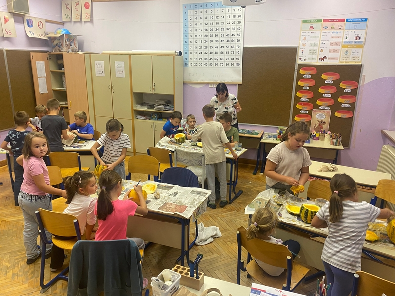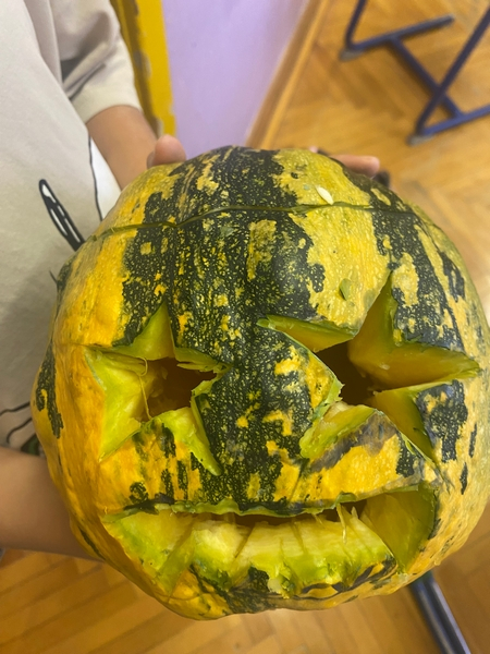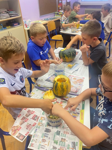 Likovna umetnost je lahko tudi drugačna, zato smo se v sredo 24. 9. 2025 družili prvošolci in četrtošolci. Skupaj smo čistili buče, jim izrezali oči, usta, … in iz njih naredili lučke.