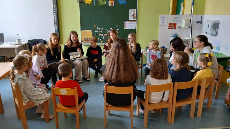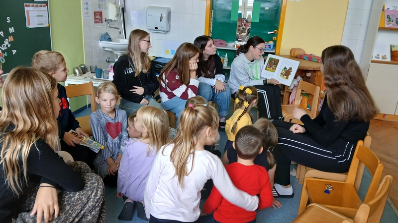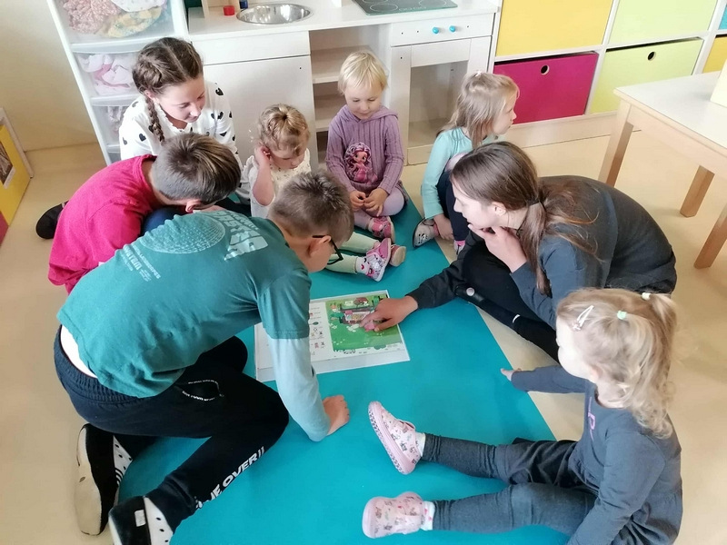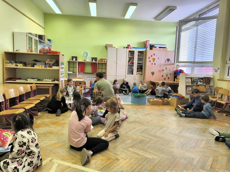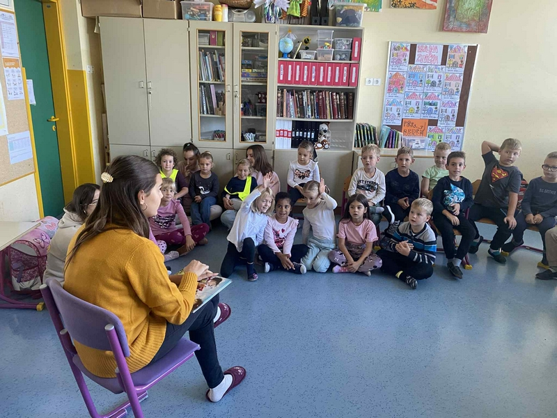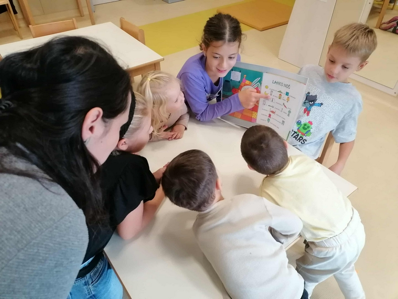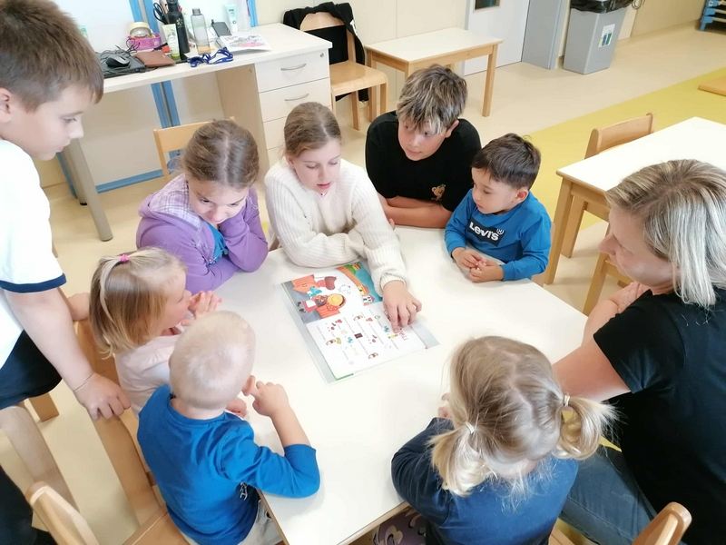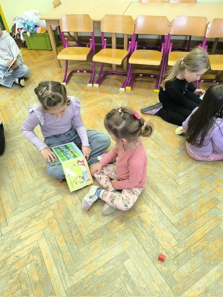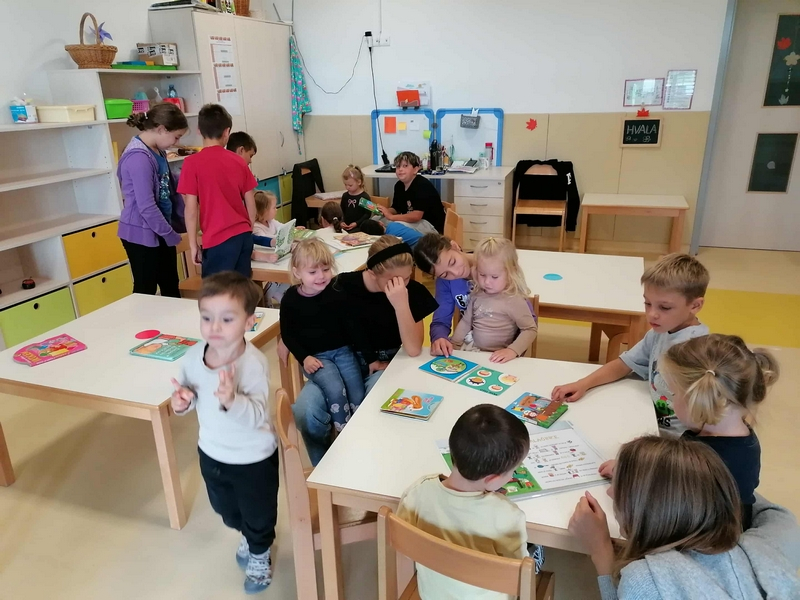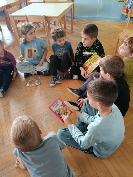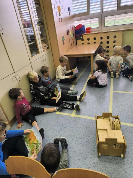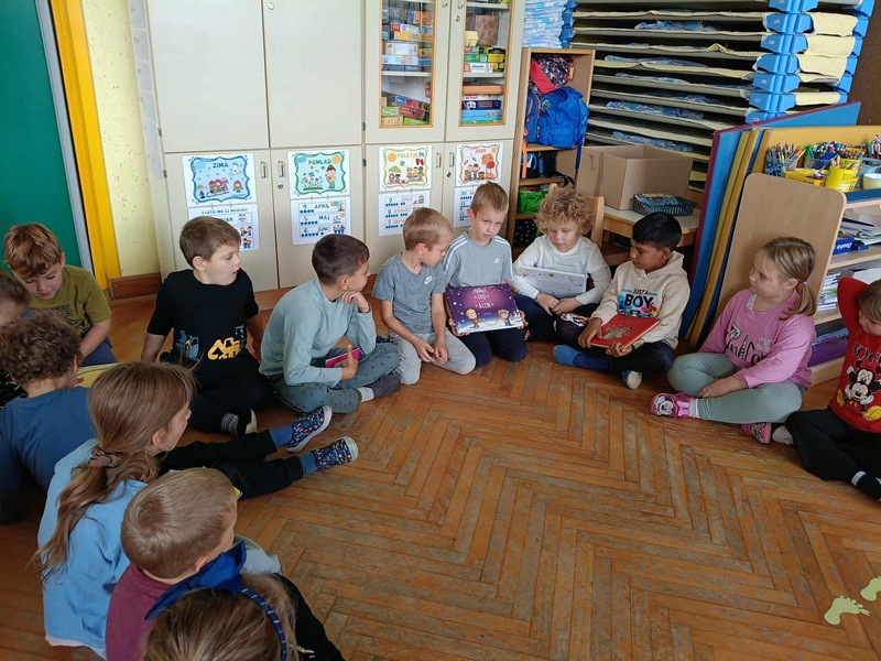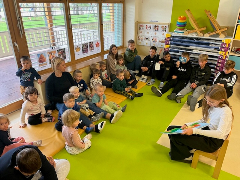 V vrtcu in šoli smo v mesecu skupnega branja in še posebej v Tednu otroka obeležili Dan skupnega branja, katerega namen je bil spodbujanje ljubezen do knjig in bralne kulture. Učenci iz šole so obiskali vrtčevske otroke, učenci višjih razredov so se povezali z mlajšimi in skupaj brali: pravljice, pesmi, izštevanke, uganke. Skupaj smo spoznali, kako nas knjige povezujejo ne glede na starost. Otroci so pripravili tudi risbice na temo prebranih zgodb, na koncu sproščenih druženj je celo zazvenela pesem.