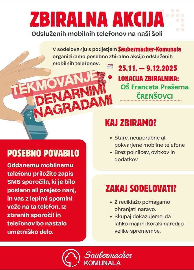 naslednji teden v torek, 25.11.2025, se začne zbiralna akcija ODSLUŽENIH MOBILNIH TELEFONOV, ki se ji bo priključila tudi naša šola. Akcija bo trajala od 25. 11. – 9. 12. 2025 v organizaciji Saubermacher Murska Sobota.