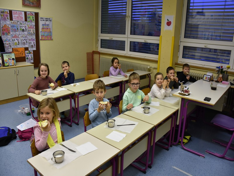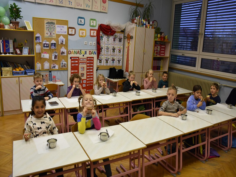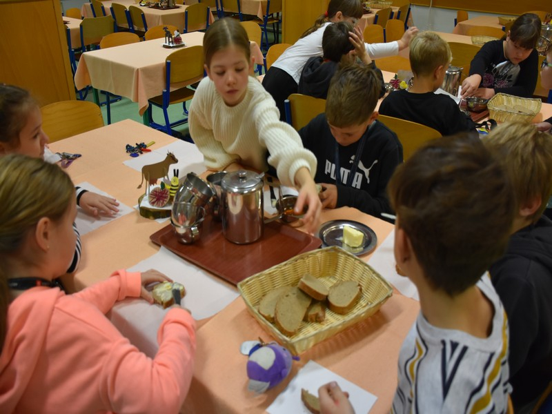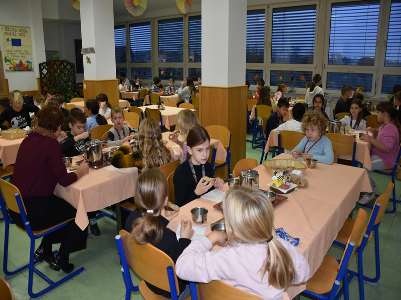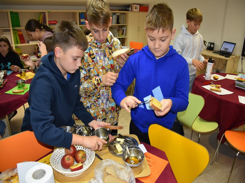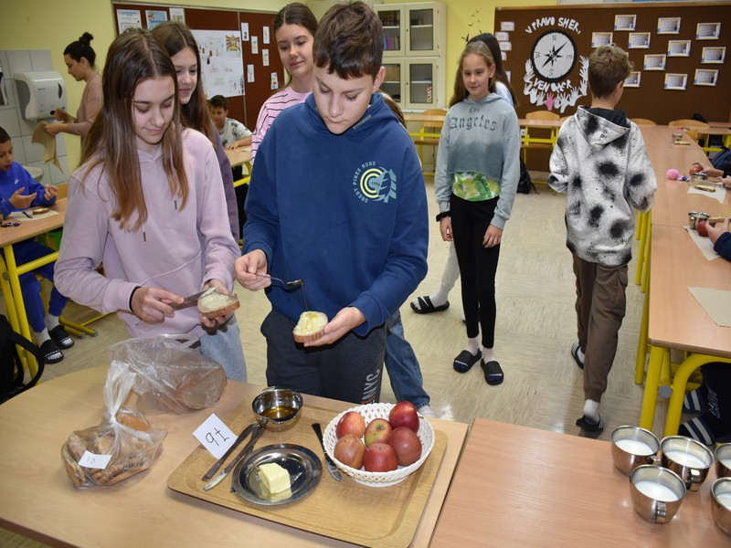 Učenci so dan začeli s pravo domačo poslastico: medom, maslom, mlekom, kruhom in jabolkom – živili, ki predstavljajo jedro tradicionalnega slovenskega zajtrka. Ob zajtrku smo se pogovarjali o pomenu zdravega začetka dneva, o izvoru živil ter o tem, kako pomembno je spoštovati delo čebelarjev, kmetov in vseh, ki sodelujejo pri pridelavi hrane.