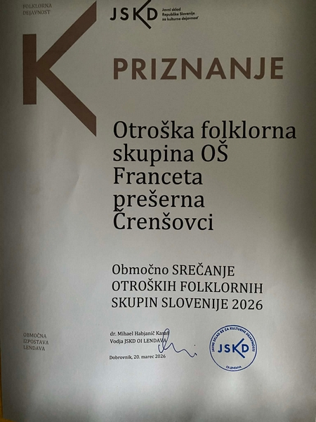 V petek, 20.3.2026, se je otroška folklorna skupine OŠ FP Črenšovci udeležila območnega srečanja otroških folklornih skupin, ki je potekalo v Dobrovniku. Plesalci so se na srečanju predstavili s spletem Žibeki, žibeki, ote dumou. V spletu so zaigrali igro Žibeki, žibeki, ki je prekmurska različica slovenske otroške igre Ali se bojite črnega moža, ritmično zapeli izštevanko Vora je ena, vuk šče spij (prilagojeno po izštevanki Ura je ena medved še spi), zaplesali ples špicpolka ali požugana.